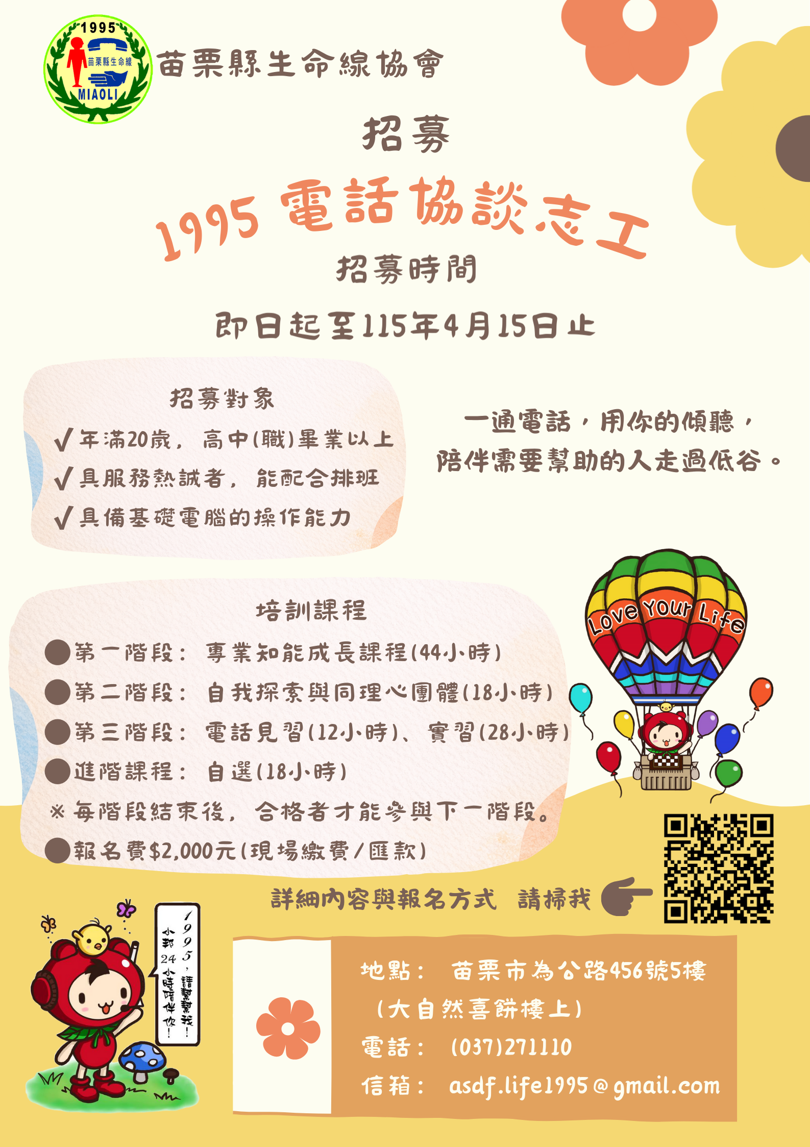 苗栗縣生命線1995第36期協談老師 招募囉! 報名網址:https://forms.gle/KyTbQFbRScwV2vBT8 服務內容:1995電話協談專線服務、活動支援、行政支援